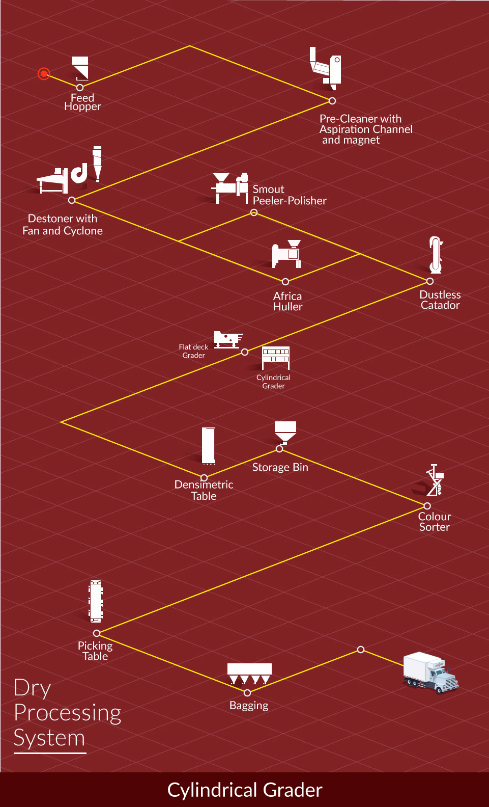 After the wet processing stage, the second stage of coffee processing is dry processing. This process involves the parchment coffee or dry cherry coffee being transformed into green coffee which is suitable for roasting. Dry processing includes multiple stages such as Pre-Cleaning, Destoning, Hulling, Densimetric Grading, Size Grading, and Final Sorting.